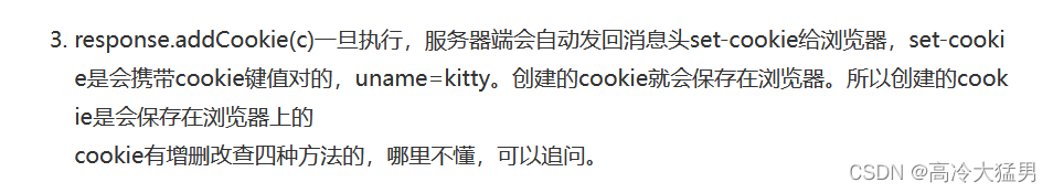 - response.addCookie(cookie);//将cookie从服务端发送给客户端浏览器保存