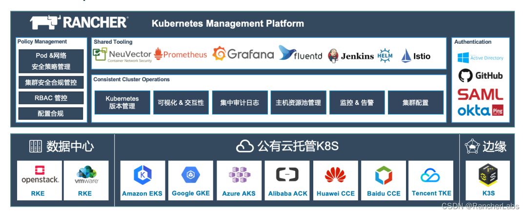 Rancher 支持国内外主流的公有云 Kubernetes 发行版,如 EKS、GKE、ACK、CCE、TKE、AKS……用户可通过 Rancher 一键创建并纳管这些云供应商的 Kubernetes 发行版。