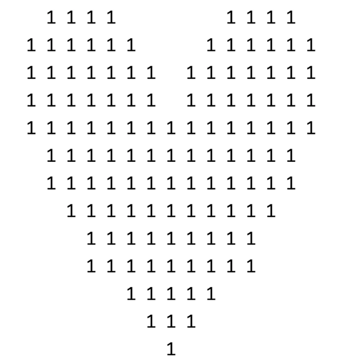 print('1' if (x*x+y*y-25)**3 < 25*x*x*y*y*y else ' ', end=' ')