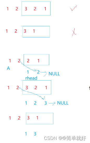 思路:将链表的后半部分的节点逆置,再将前半部分的值和后半部分的值相比。因为额外的空间复杂度为O(1),所以不能整体逆置,整体逆置要重新开辟一个和原来一样长的链表空间。所以这里将后半部分的节点逆置之后就可以比较了。