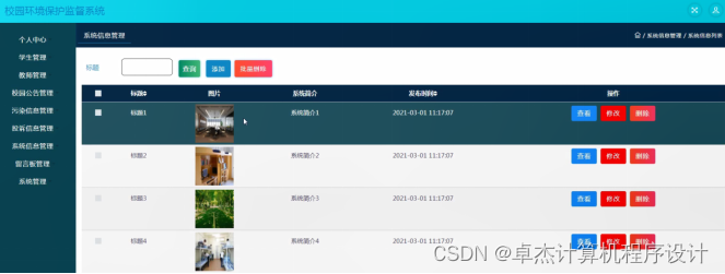 校园公告管理,在校园公告管理页面中可以对标题、图片、公告内容、发布时间等信息进行查看,修改或删除等操作,如图5-10所示。