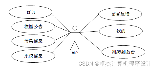 学生和教师进入系统可以查看首页、校园公告、污染信息、系统信息、留言反馈、我的、跳转到后台等操作。用户用例图如图3-1所示。