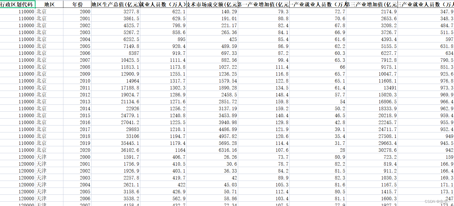 原始数据:地区生产总值(亿元)、就业人员数(万人)、技术市场成交额(亿元)、第一产业增加值(亿元)、第一产业就业人员数(万人)、第三产业增加值(亿元);