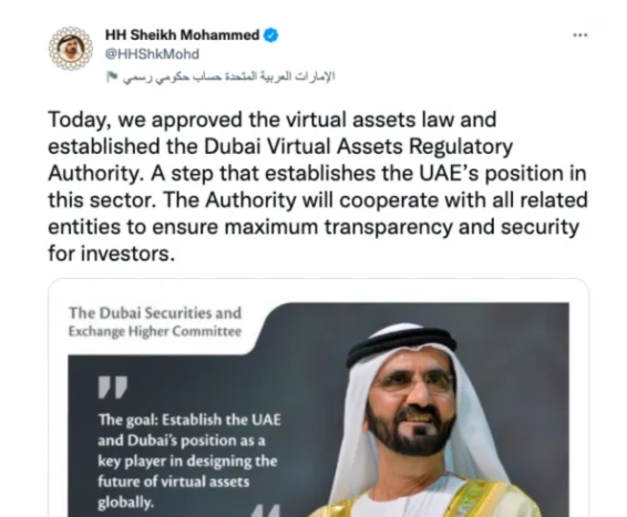 2022年3月9日,阿联酋总理兼统治者Sheikh Al Makturm发文表示,迪拜通过了第一部监管虚拟资产的法律,并建立了一个独立的机构,在监管、许可、治理以及与本地和全球金融系统的一致性方面,监督虚拟资产在迪拜的发展。