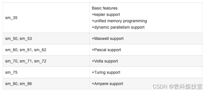 | compute_35 compute_37 | Kepler support(开普勒架构) Unified memory programming Dynamic parallelism support |