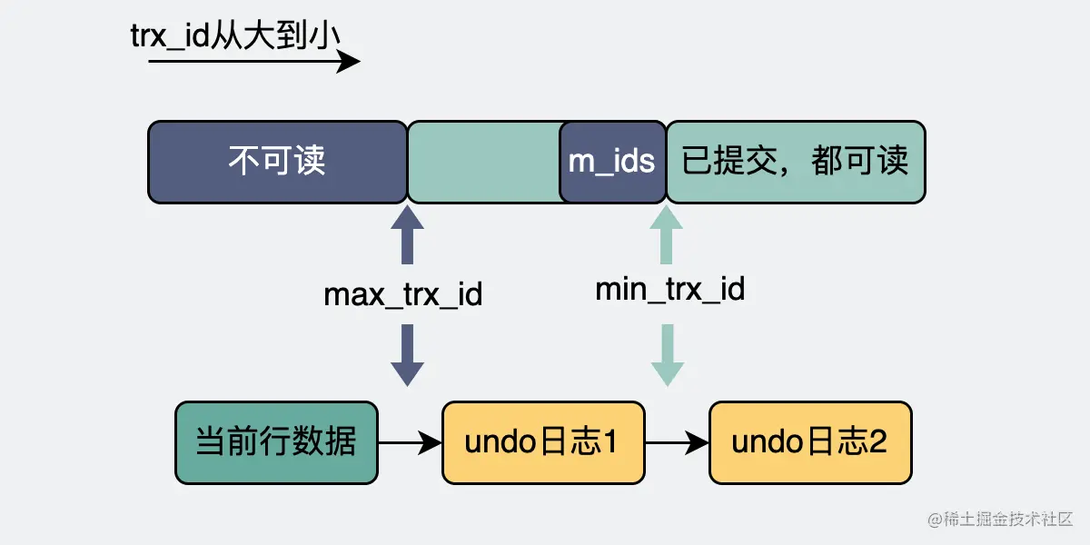 整个数据库里有那么多事务,这些事务分为已经提交(commit)的,和没提交的。没提交的,意味着这些事务还在进行中,也就是所谓的活跃事务。所有的活跃事务的id,组成m_ids。而这其中最小的事务id就是read view的下边界,叫min_trx_id。