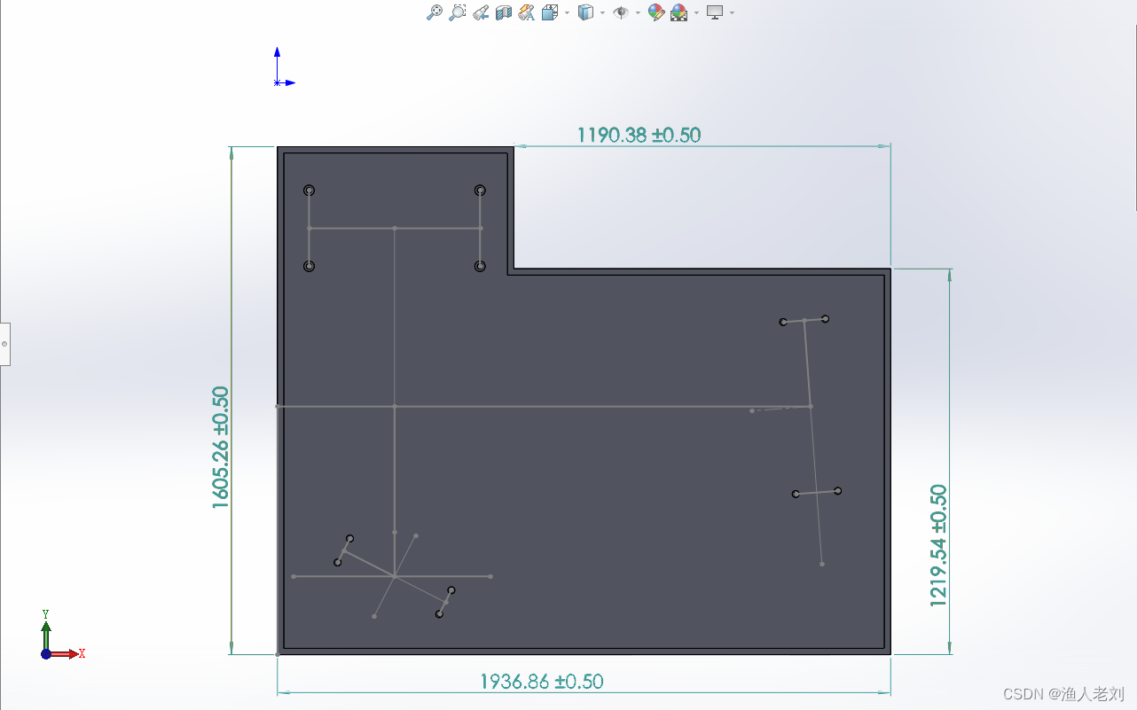 箱体部分尺寸如图所示,底板上绘制光路图,并开有对应零部件固定位置的螺纹孔。底板厚50mm,外壳厚度为20mm。开有320mm的通光孔,作为有效通光口径。