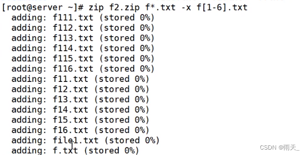 [root@server ~]# zip passwd1.zip f*.txt -x f[1-6].txt---将f*.txt文件压缩到passwd1.zip文件中,排除f[1-6].txt