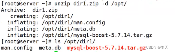 [root@server ~]# unzip dir1.zip -d /opt/---解压文件到指定/opt目录下