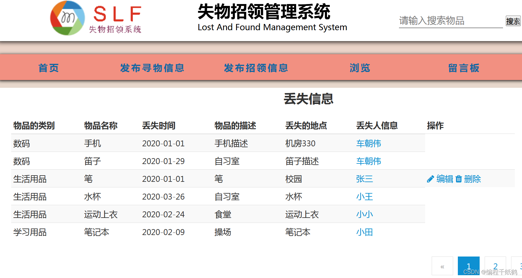 用户进入首页后,点击“浏览”按钮,选择“寻物信息浏览”,会出现各种物品的丢失信息,包括物品的类别、物品名称、丢失时间、丢失地点、丢失人信息和物品的描述,其中如果用户之前发布过寻物信息,也会显示在上面,并且点击“编辑”按钮后可以跳转到添加寻物信息界面完成寻物信息的更新,点击“更新寻物”按钮就可以完成寻物信息的更新,对于过期的信息,也可以自行删除。