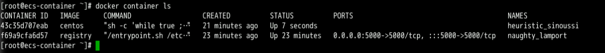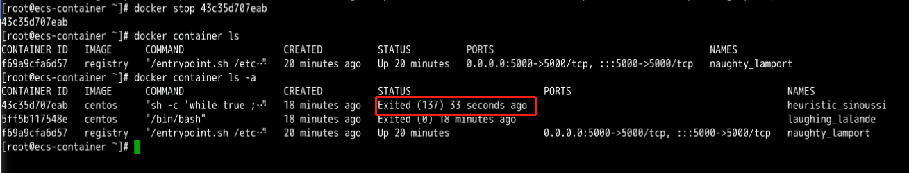 说明:容器状态变更为Exited,并且已经无法在docker container ls命令中查询到该容器,必须配合-a参数才能查询到。