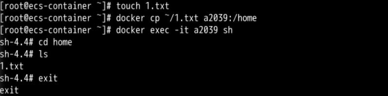 docker exec进入容器,并验证文件拷贝成功,输入exit退出容器。