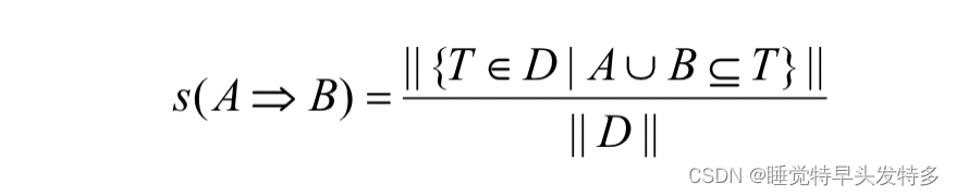 规则A=>B" role="presentation" style="position: relative;">A=>B在数据集中D中的支持度为s,其中s表示D中包含A∪B" role="presentation" style="position: relative;">A∪B(即同时包含A和B)的事务的百分率,即可用条件概率P(A∪B)" role="presentation" style="position: relative;">P(A∪B)表示。