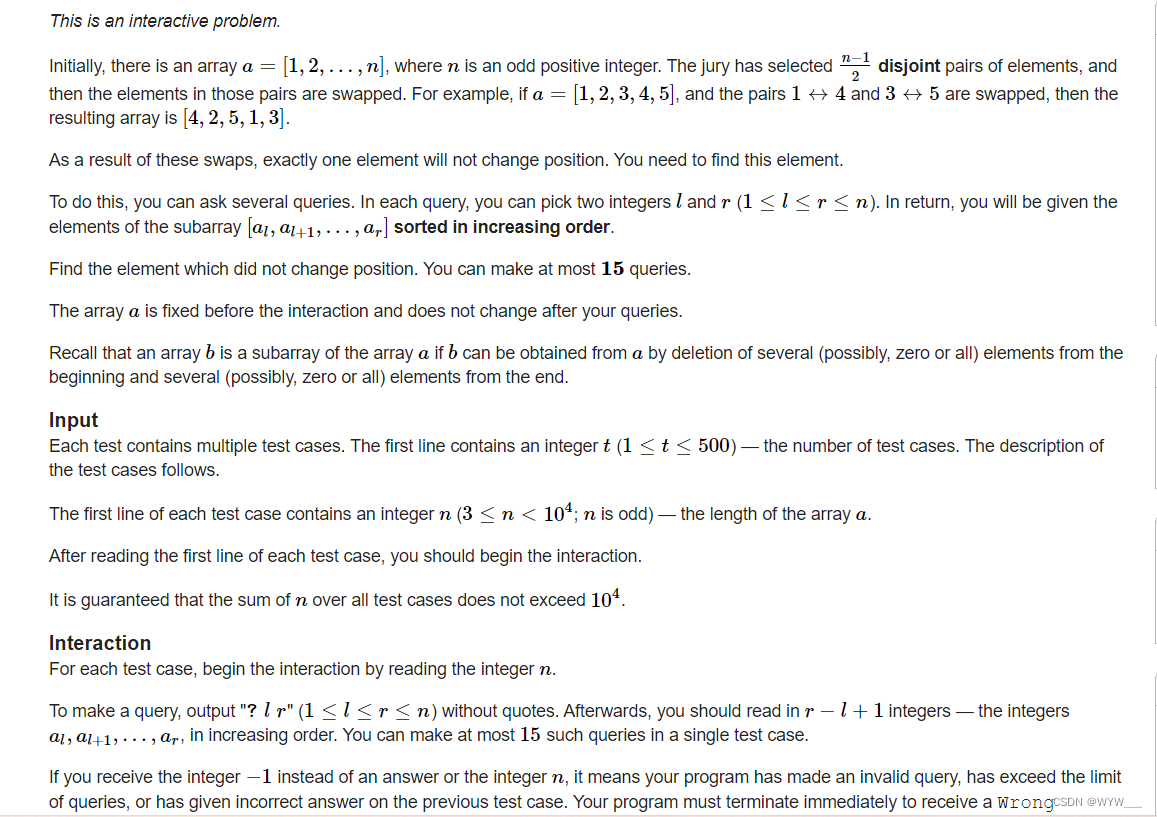 要做到这一点,你可以提出几个查询。在每个查询中,你可以选择两个整数l和r(1≤l≤r≤n)。作为回报,你将得到子数组[al,al+1,...,ar]中按递增顺序排列的元素。