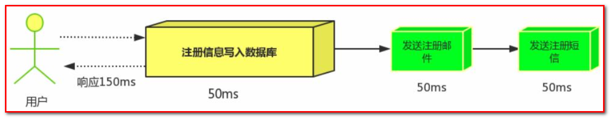 假设三个业务节点分别使用50ms,串行方式使用时间150ms,并行使用时间100ms。虽然并行已经提高了处理时间,但是,前面说过,邮件和短信对我正常的使用网站没有任何影响,客户端没有必要等着其发送完成才显示注册成功,应该是写入数据库后就返回.