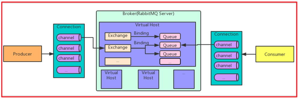 Virtual host:出于多租户和安全因素设计的,把 AMQP 的基本组件划分到一个虚拟的分组中,类似于网络中的 namespace 概念。当多个不同的用户使用同一个 RabbitMQ server 提供的服务时,可以划分出多个vhost,每个用户在自己的 vhost 创建 exchange/queue 等