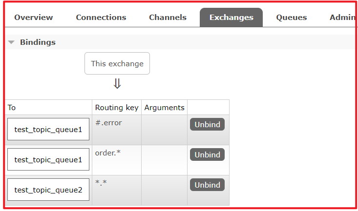 Binding:exchange 和 queue 之间的虚拟连接,binding 中可以包含 routing key。Binding 信息被保存到 exchange 中的查询表中,用于 message 的分发依据