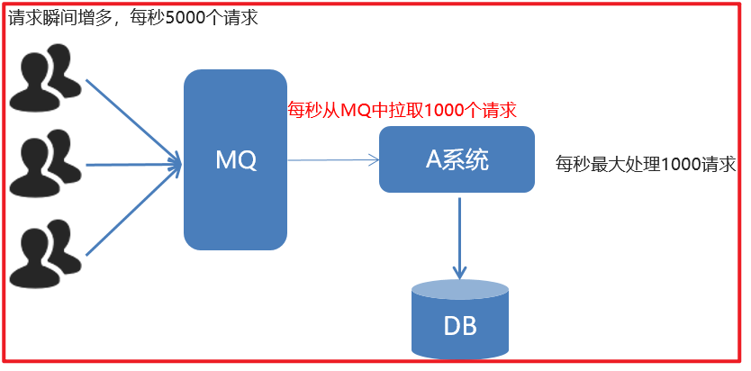 系统A慢慢的按照数据库能处理的并发量,从消息队列中慢慢拉取消息。在生产中,这个短暂的高峰期积压是允许的。