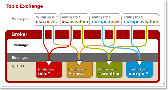 Exchange:message 到达 broker 的第一站,根据分发规则,匹配查询表中的 routing key,分发消息到queue 中去。常用的类型有:direct (point-to-point), topic (publish-subscribe) and fanout (multicast)