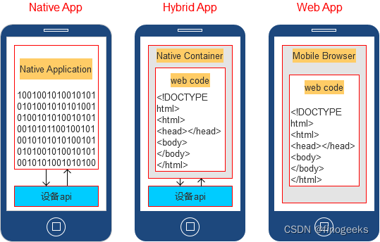移动端的开发方式三分天下:纯原生(Native App)、混合开发(Hybird App)、网页应用(Web App)。