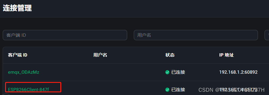 登录EMQX服务器,查看当前连接的客户端列表,当出现下图红框所示的客户端ID时,就证明已经成功连接。当PC端的服务器连接到路由器的有线部分,而D1连接的是无线,二者尽管不在同一个网段(大多数家用的路由器都是这样的),但是他们仍然可以互相访问。所以可以看到连接成功了。