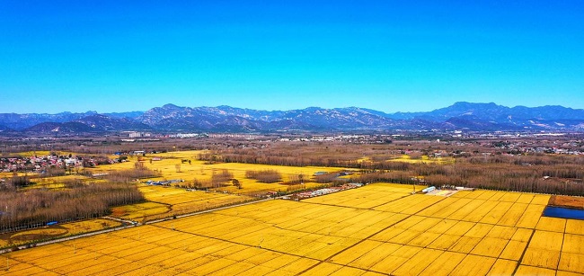 雄安新区成立以来,为了白洋淀的生态环境恢复,原有淀内、淀边等地块的水稻种植逐渐退出。为传承传统农业种植优势,留得住乡愁,安新县打造田园都市的新型农业示范区,让“鱼米之乡”重现白洋淀。在雄安新区安新县白洋淀畔,有一大片色泽金黄的水稻种植区,从空中俯瞰,可以看到不同颜色的稻田组成了“鱼米之乡”,“百鸟乐园”的字样,田间稻香四溢,稻谷颗粒饱满、丰收在即。