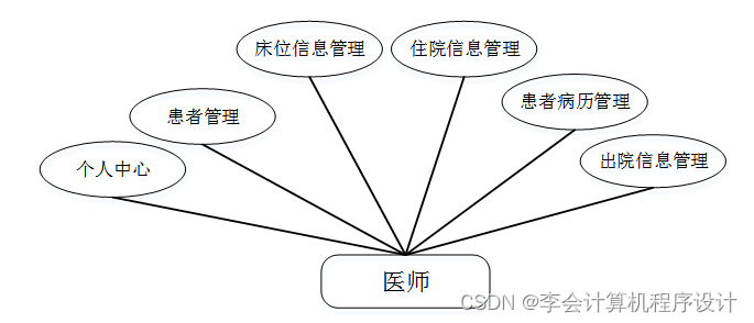 医师进入系统后能对个人中心,患者管理,床位信息管理,住院信息管理,患者病历管理,出院信息管理等功能进行医师范围内操作。医师用例图如图3-3所示。