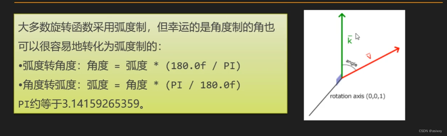 旋转:glm::rotate(model, (float)glfwGetTime() * glm::radians(50.0f), glm::vec3(1.0f, 1.0f, 0.0f));