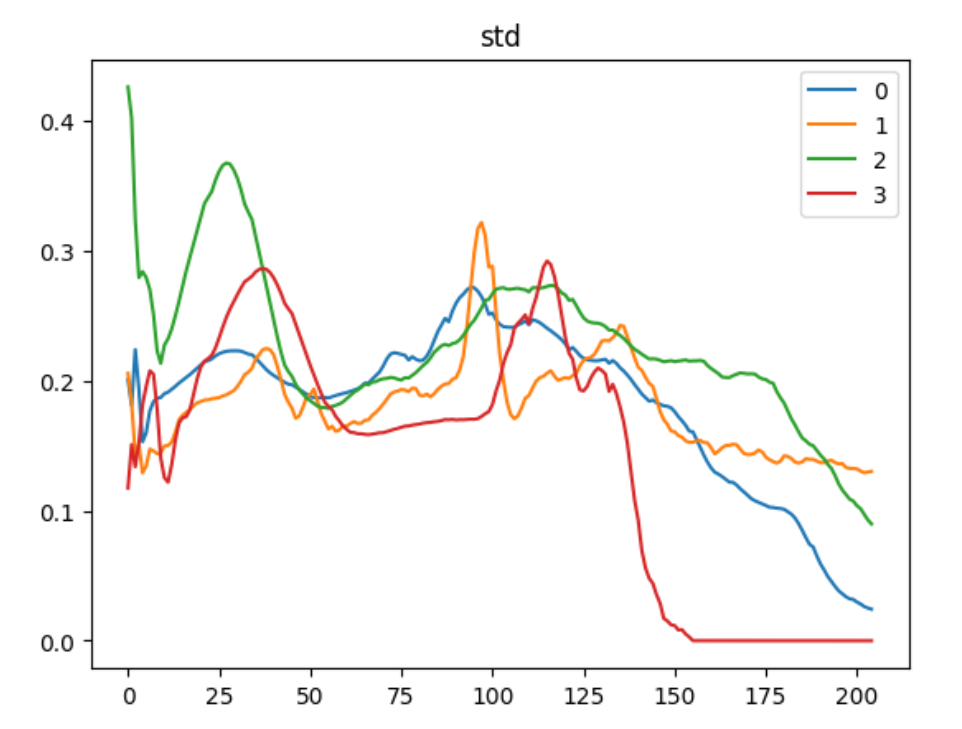 emmm可以发现,三类数据在0-130左右表现出很强的脉动,之后又断崖式下降,可能是突然的心悸,或者是类似室上性心动过速这种心脏病。零类数据我们一开始推测其为正常数据,在标准差上,波动性较小,相对稳定。一类数据变化最频繁,心跳比较不规律,但二类和零类差别不大,应该是一个区分难点。