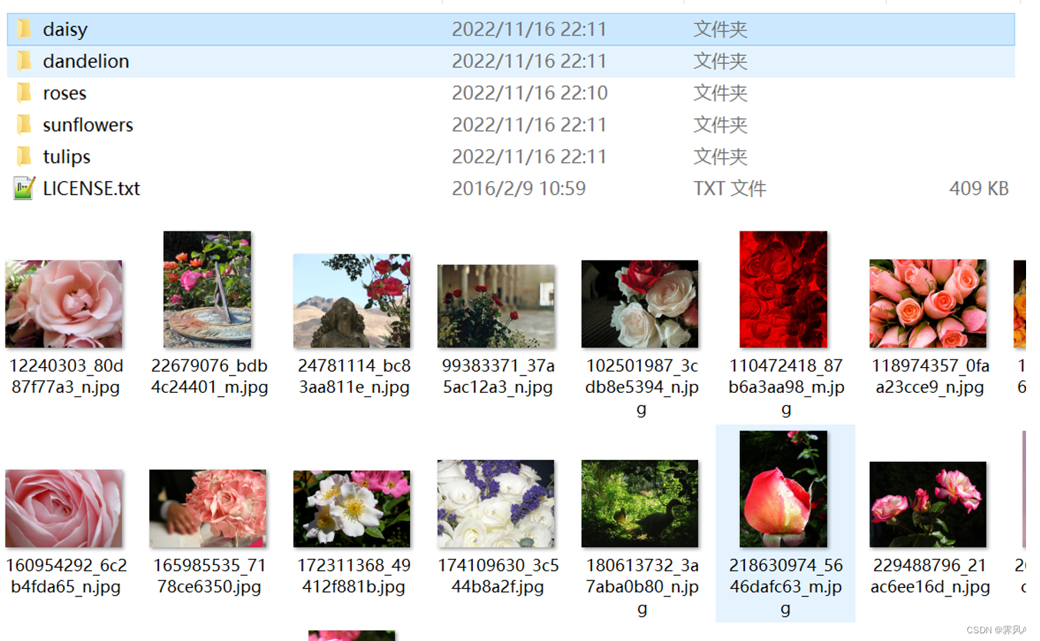 本文使用花分类数据集,下载链接: 花分类数据集——http://download.tensorflow.org/example_images/flower_photos.tgz