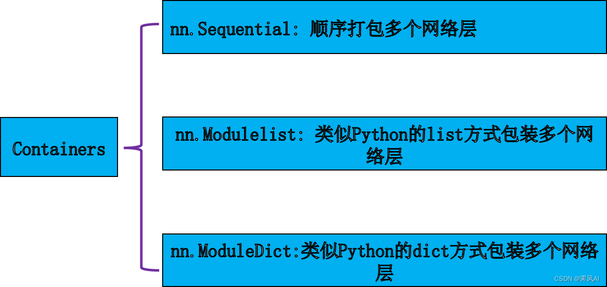 nn.Sequential 是 nn.Module 的容器,用于按顺序包装一组网络层,在模型复杂情况下,使用 nn.Sequential 方法对模块划分。除了 nn.Sequetial,还有 nn.ModuleList 和 nn.ModuleDict。