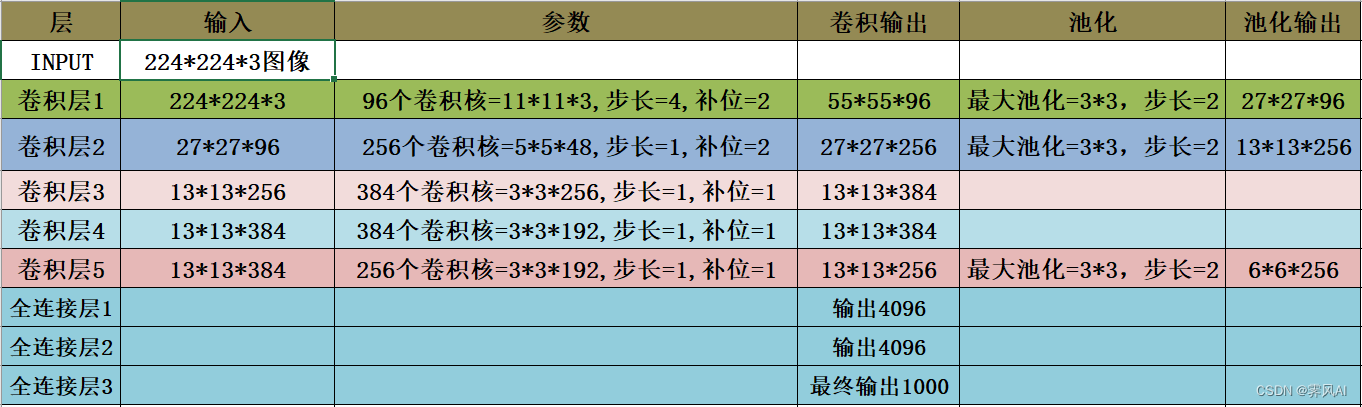 AlexNet 共有 8 层组成,其中包括 5 个卷积层,3 个全连接层。各层参数如下: