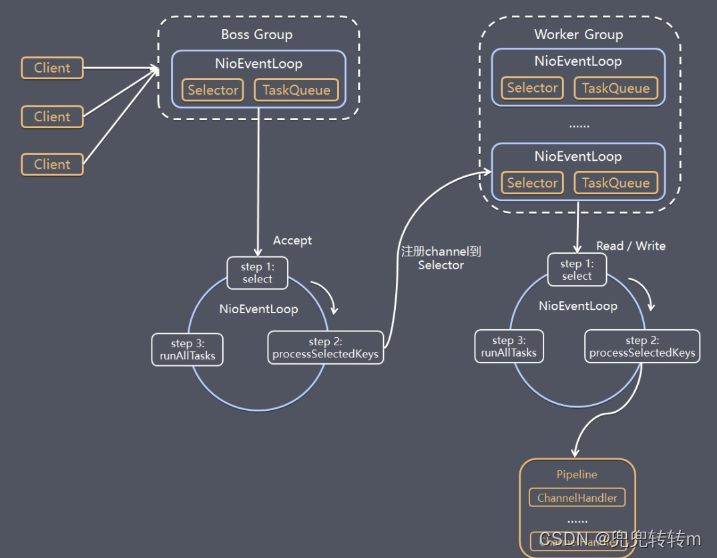 2、Server创建事件循环组--里面是事件循环对象--事件循环对象包含(单线程+selector)