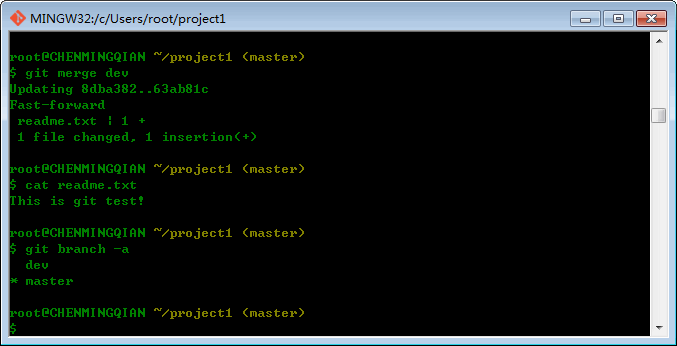 git merge 命令用于合并指定分支到当前分支。合并后,再查看readme.txt的内容,就可以看到,和dev分支的最新提交是完全一样的。如下图: