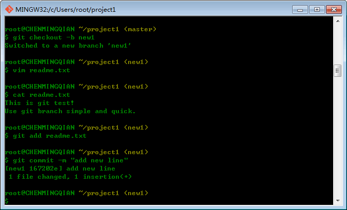 下面我们来演示一下不同分支修改同一个文件产生冲突问题,下面我们来创建一个新的分支,继续开发新功能: