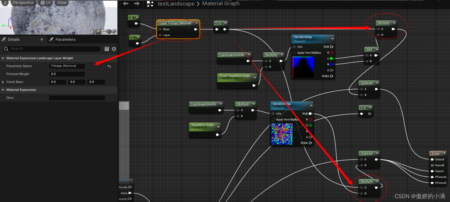 5 利用UE地形节点 Landscape Layer Weight节点创建一个Foliage Removal层,用来控制 Grass Output节点生成的植被。
