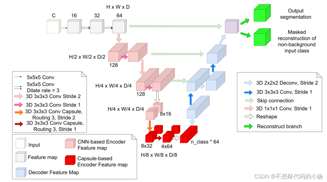 该组件将前一个组件的可视特征大小H×W ×D×64作为其输入。组件从较低级别的特性提取到较高级别的特性。由于较低层次特征捕获的是短程信息,所以使用了卷积块。卷积层定义为通道数从64增加到128,核大小为3 × 3 × 3。下采样采用核数为3 × 3 × 3、走向为2的卷积层进行。更高层次的功能捕获远程信息,因此,使用3D胶囊块。我们的网络编码器路径中的胶囊类型个数设为(8,8),为了通过边距损失[16]监督学习模型,最后一个胶囊层中的胶囊类型个数等于分割中的类别个数.最后一层胶囊层的形状为H/8 × W/8 × D/8 × C × A,其中C为胶囊类型的数量,A为每个胶囊的尺寸