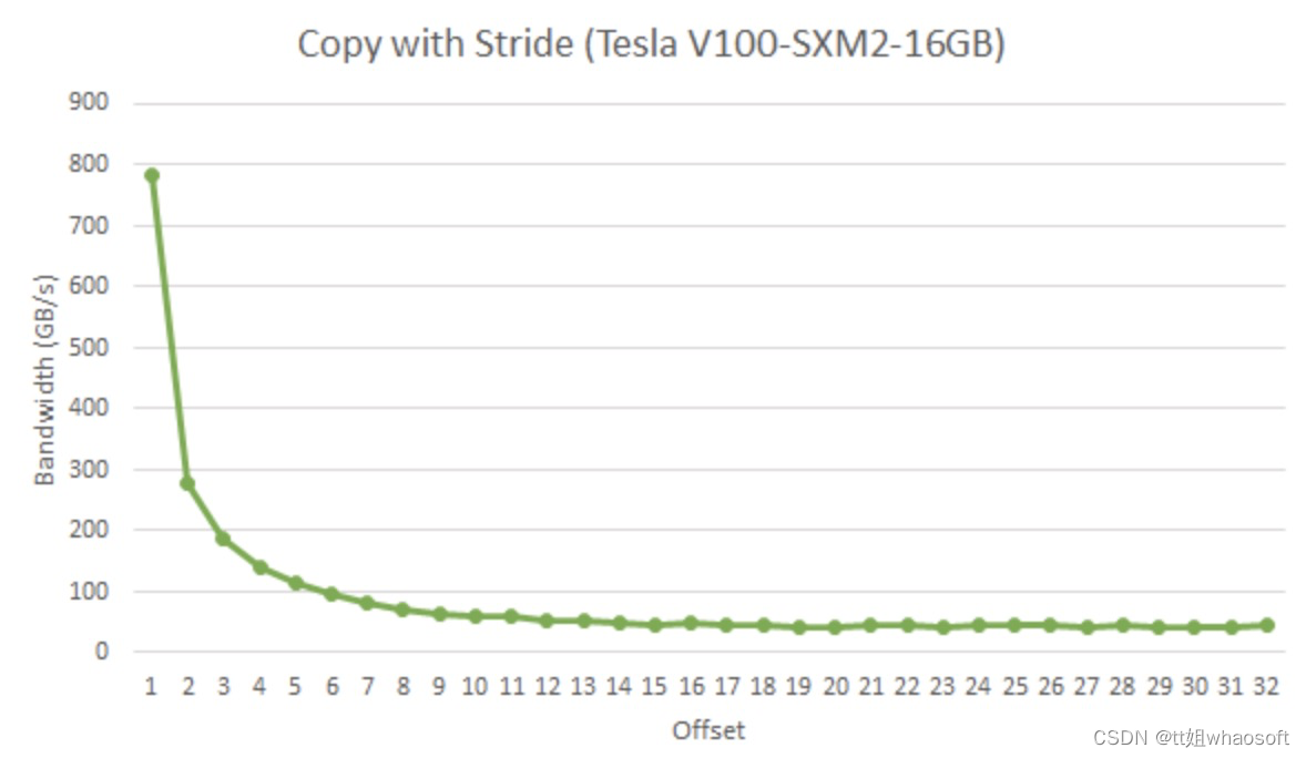 这里借用一下 Nvidia 的图。如果同一个 warp 内的 thread 都访问每一行的开头,那么如果一行超过 8 个 float,那么每一个 thread 都需要一个 sector 去请求它们需要的数据,这就造成了 sector 浪费。而实际中每一行的元素往往都会大于 8 个 float,因此会有非常大的性能损失。下图为一个 warp 在拷贝时,每个 thread 之间间隔的大小,单位为 float。可以看到在间隔为 2 时就已经有一半的性能损失了,这很不好。