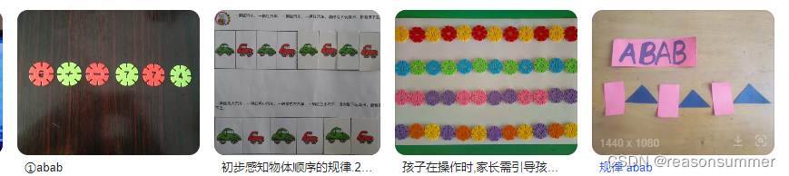 中班幼儿需要掌握ABAB规律排序,如下图所示,AB两个元素能外形不同、颜色不同。