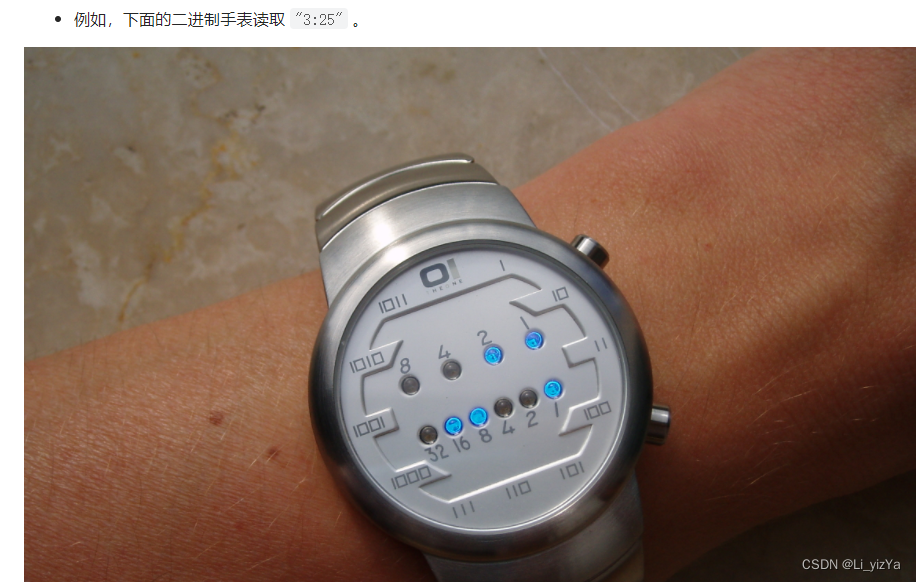 二进制手表顶部有 4 个 LED 代表 小时(0-11),底部的 6 个 LED 代表 分钟(0-59)。每个 LED 代表一个 0 或 1,最低位在右侧。