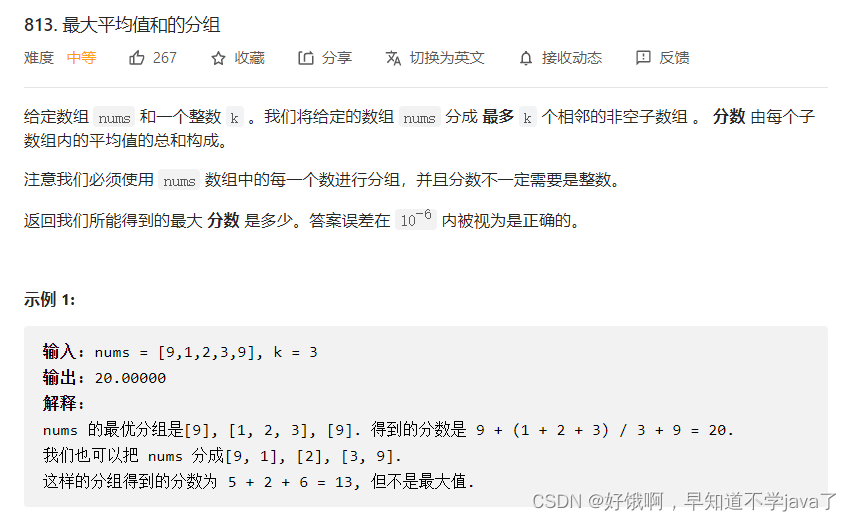 状态转移公式:再定义一个j,j看作数组的断点,当k>1时,取dp[j][k-1]+avg(j,i)的最大值,这个值就是新的dp,也就是dp[i][n]=Math.max(dp[i][n],dp[j][n-1]+(sum[i]-sum[j])/(i-j))。