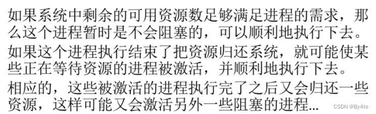 如果分配了资源之后,系统中找不出任何一个安全序列,系统就进入了不安全状态。这就意味着之后可能所有进程都无法顺利的执行下去。