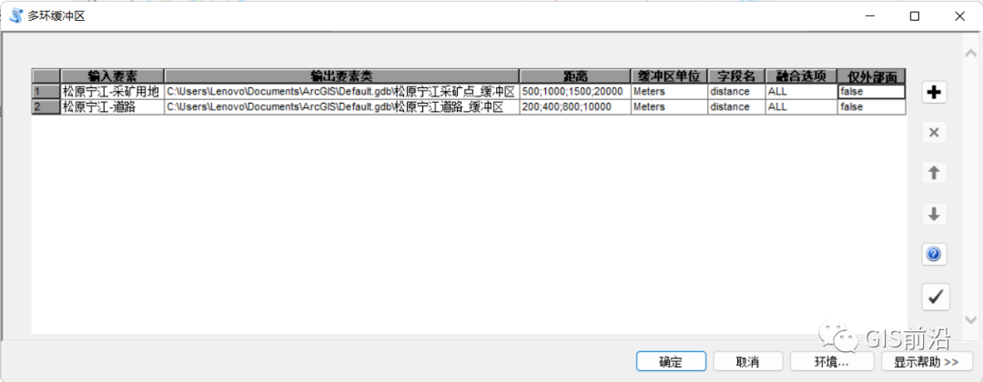 利用多环缓冲区工具对之前从总的土地利用图层中提取出来的水体、道路、矿点和居民点数据按生态安全等级分级表进行多重缓冲区分析。