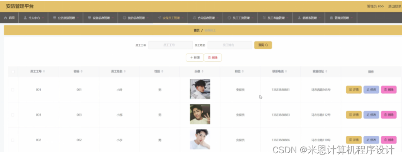 安保员工管理,在安保员工管理页面中可以对员工工号、密码、员工姓名、性别、头像、职位、联系电话、家庭住址等信息进行详情,修改或删除等操作,如图5-6所示。