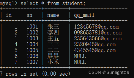 insert into student values(1,1001,"张三","12345678@qq.com");