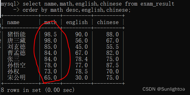 5.对于多个字段进行排序时,排序优先级随书写顺序。(先看第一个标准、第二个、第三个......直到可以分出胜负即可。