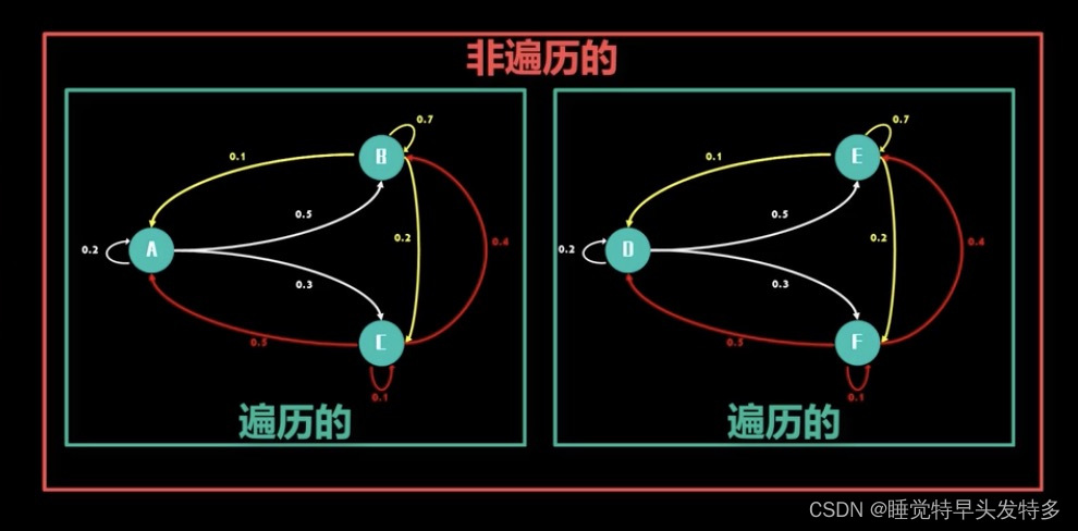 上图两个独立的马尔可夫链都是遍历的,但是作为一个整体便不再遍历,因为ABC节点与DEF节点非两两连通。