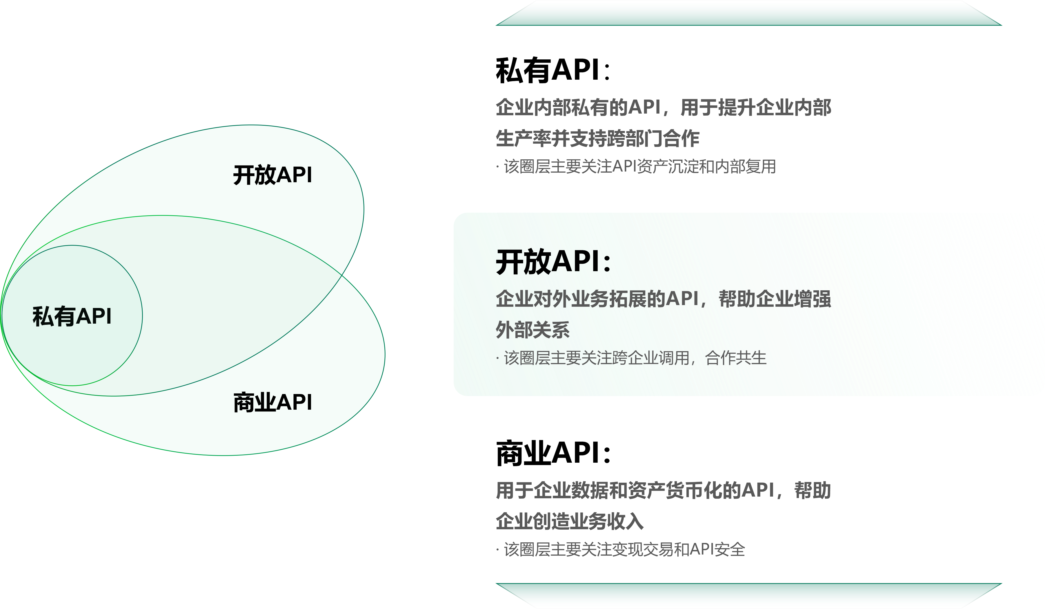 我们说API生态是企业基于API接口共生的资源交易生态,这里面的交易行为在API生态上其实是分圈层的。分为私有API圈层、开放API圈层和商业API圈层,每个圈层都是一个自洽的交易闭环。
