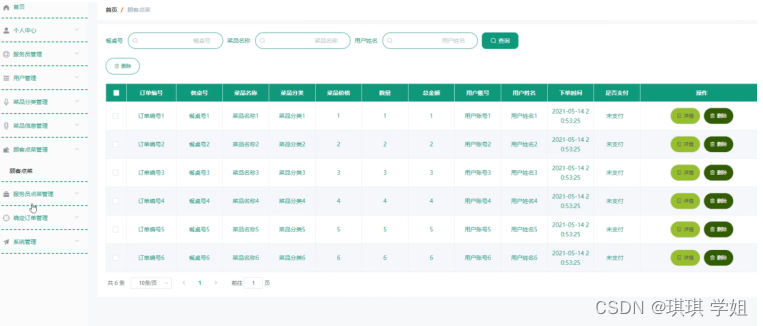 顾客点菜管理,在顾客点菜管理页面可以查看订单编号、餐桌号、菜品名称、菜品分类、菜品价格、数量、总金额、用户账号、用户姓名、下单时间、是否支付等信息,并可根据需要进行详情、删除等操作,如图5-12所示。