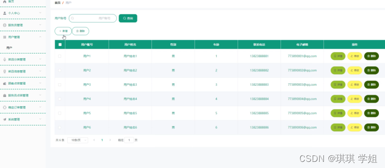 用户管理,在用户管理页面可以查看用户账号、用户姓名、性别、年龄、联系电话、电子邮箱等信息,并可根据需要进行详情、修改或删除等操作,如图5-9所示。